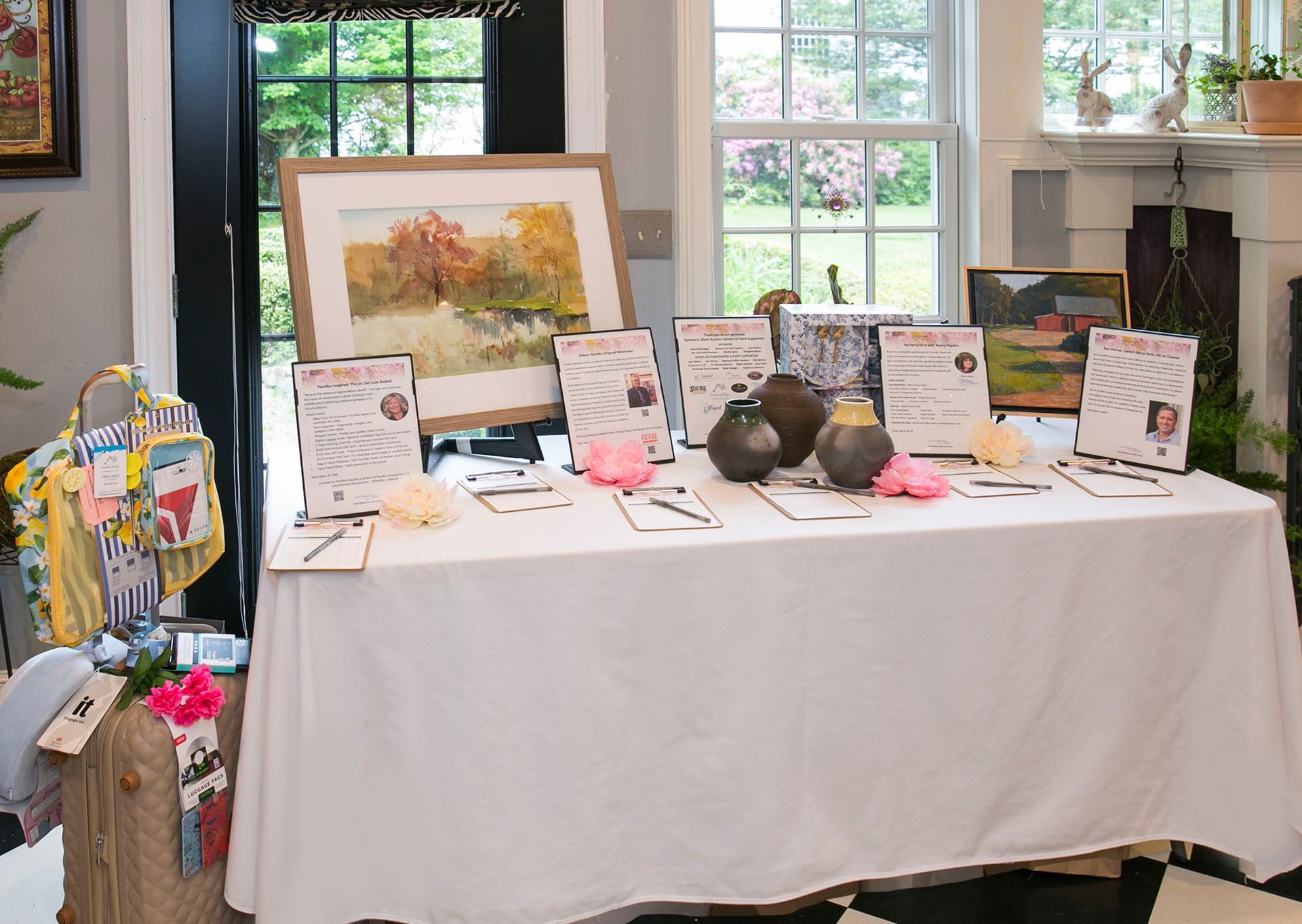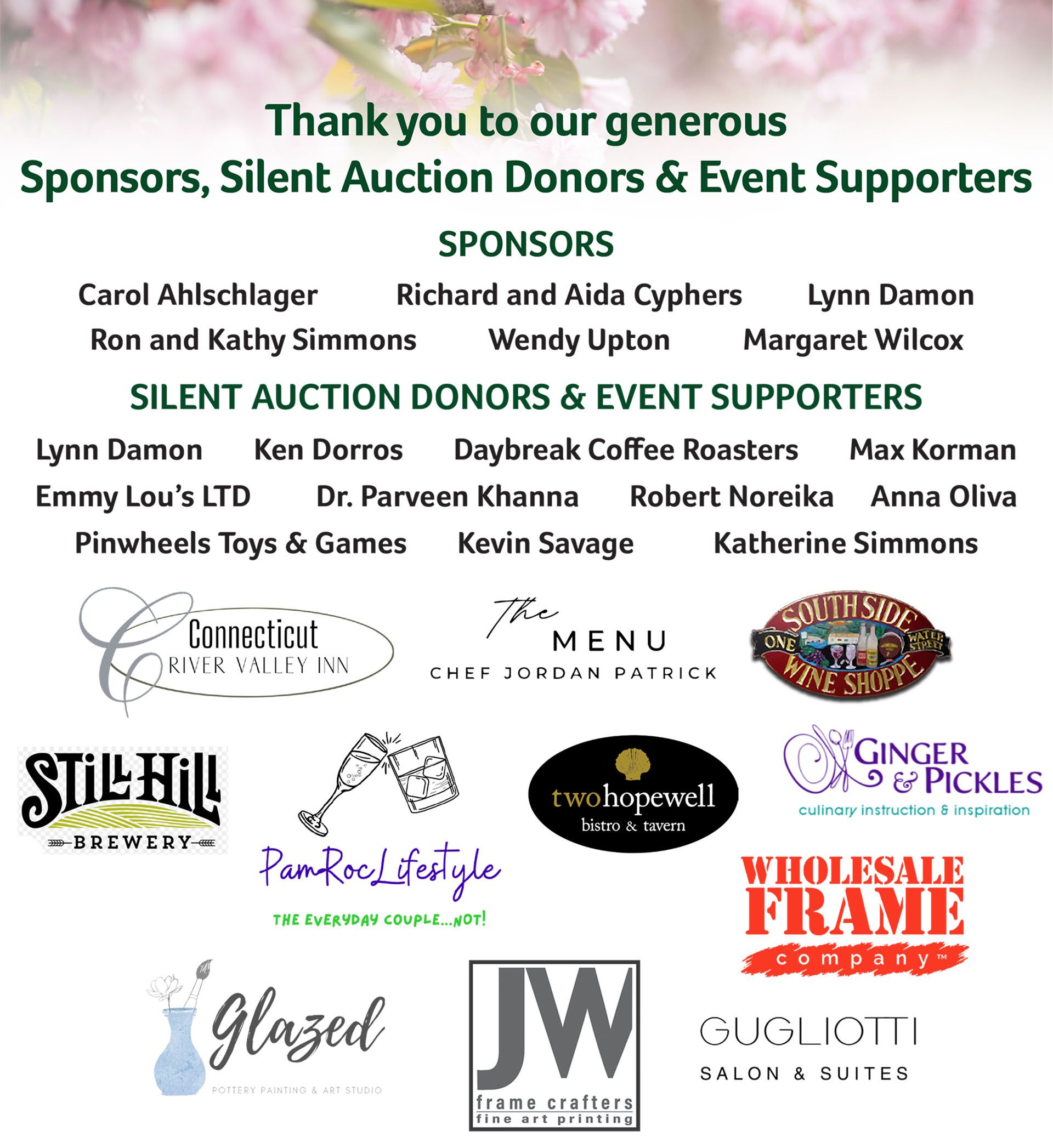 2025 COLOR YOUR SPRING WITH ART on Thursday, May 29, from 5 – 8 pm welcomed Spring with an elegant and fun-filled cocktail party and silent auction at the Connecticut River Valley Inn, 2195 Main Street in the heart of Glastonbury’s historic district. A heartfelt thank you to our amazing sponsors, generous donors, and wonderful guests who made this event truly special. A special shout-out to Pat Brubaker at the Connecticut River Valley Inn for providing such a beautiful venue; Chef Jordan Patrick for the delicious menu; Nancy Hayden from Ginger & Pickles Baking Company for the scrumptious confections; Craig Witzke from Southside Wine Shoppe and our friends at Still Hill Brewery for the carefully selected wine and beer tastings; Max Korman for his lively music.